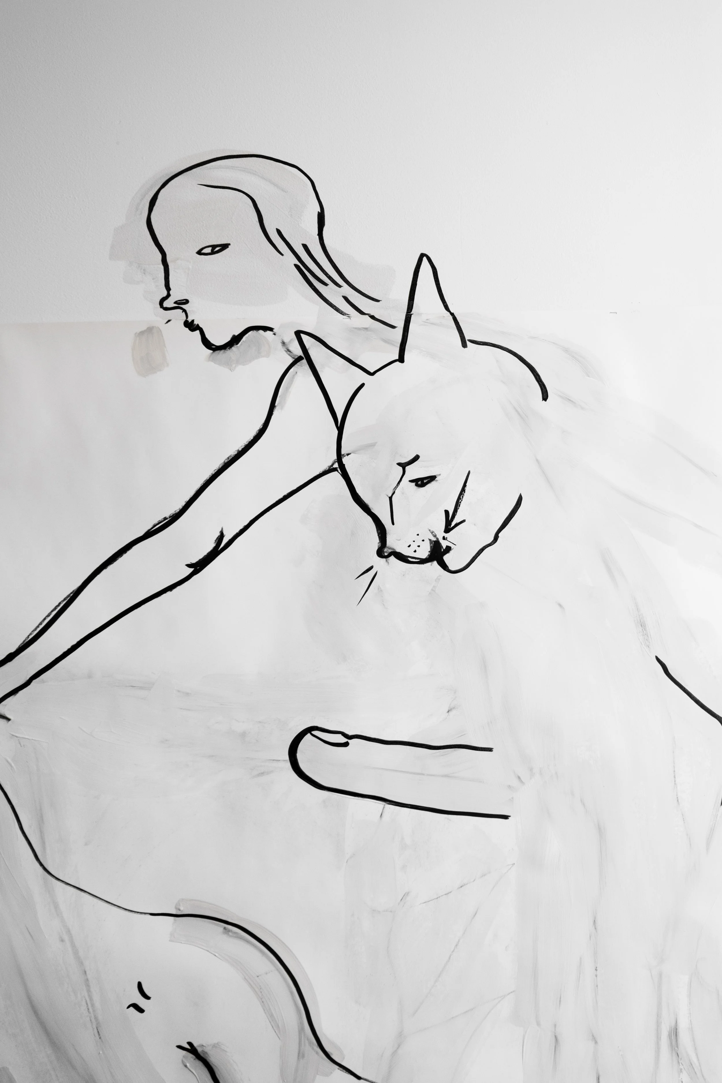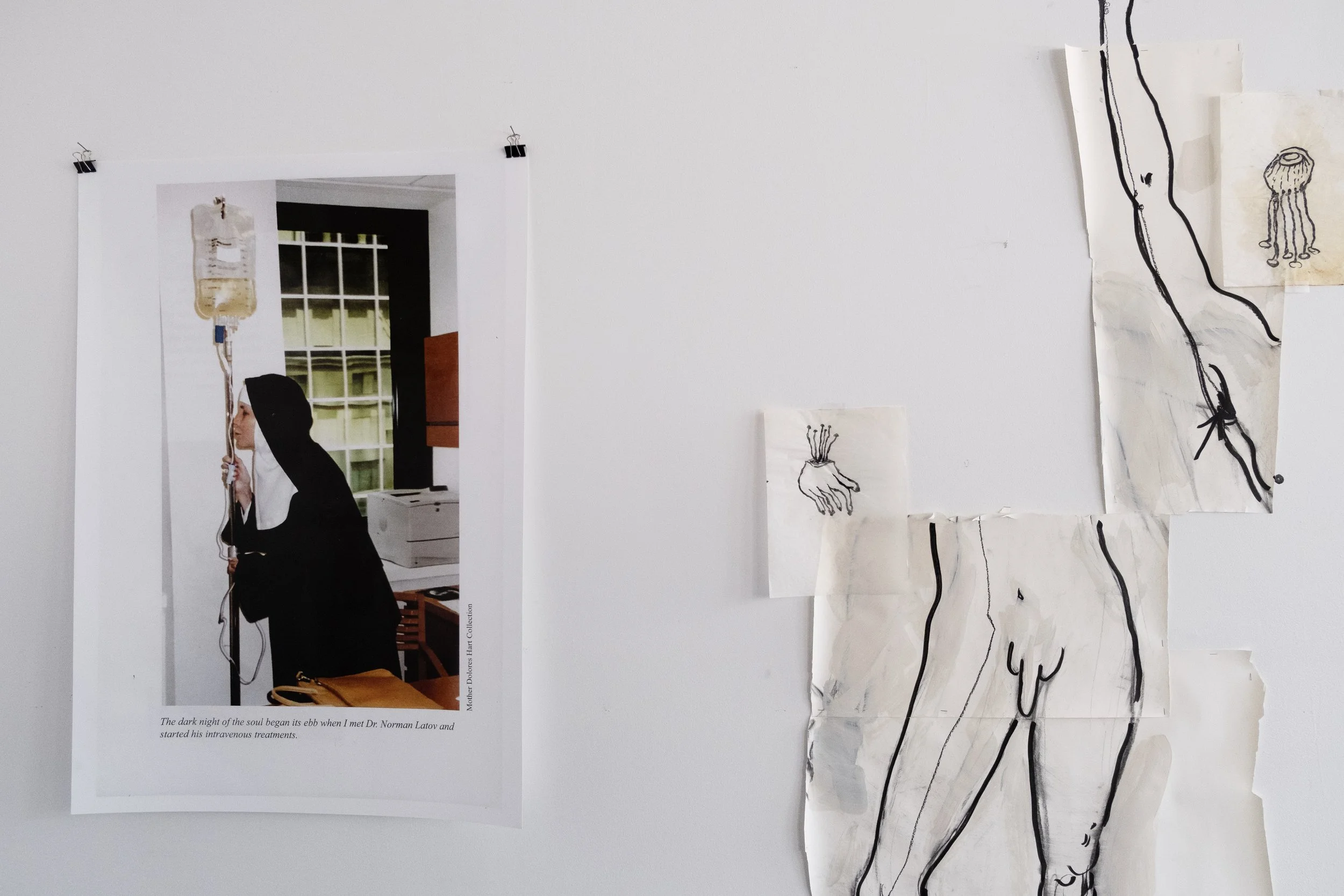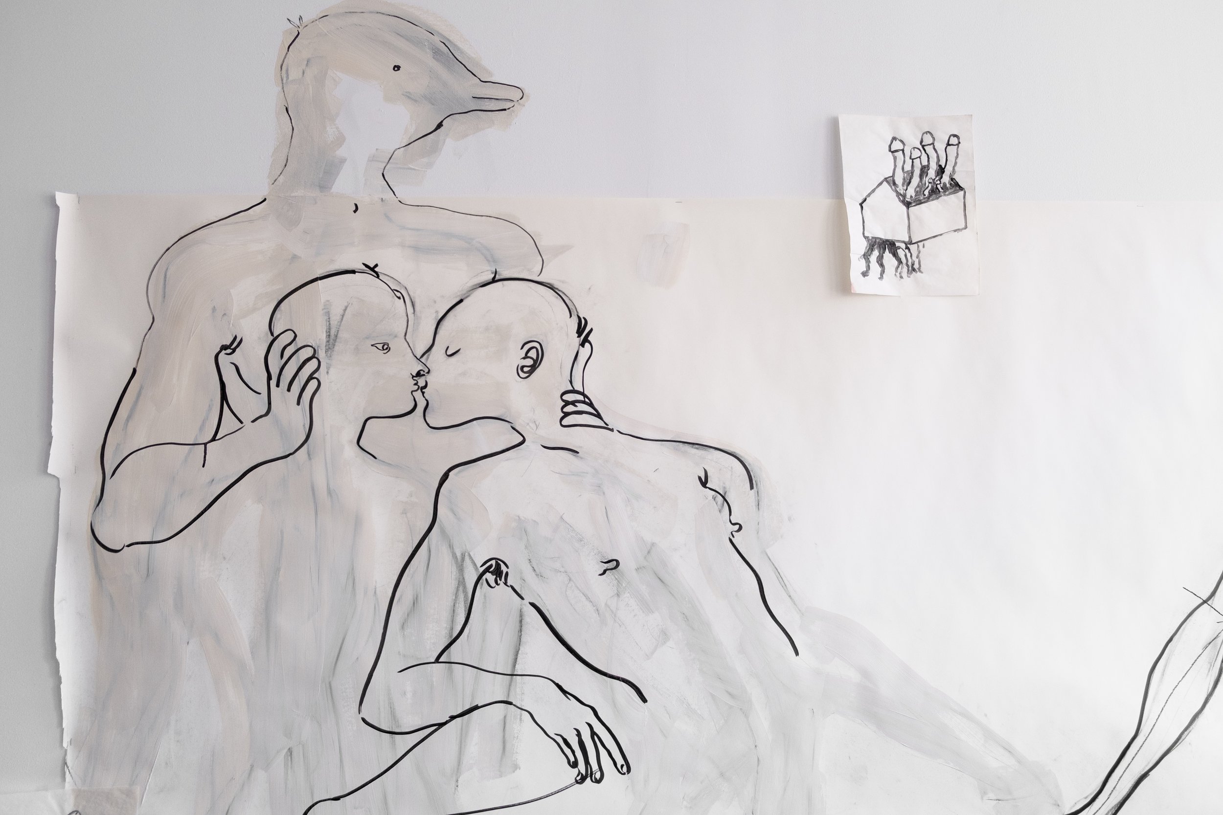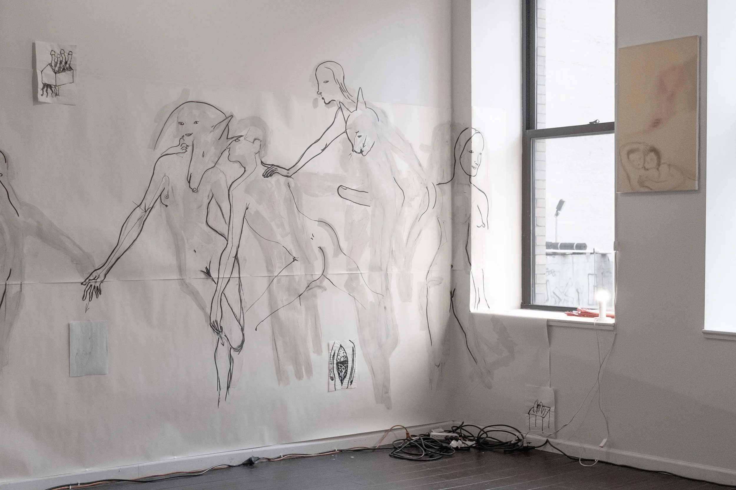 Inspired by the organ clock of Classical Chinese Medicine’s chrono-medicine system, these drawings were made improvisationally during the installation of the exhibition. Handforth draws out the heart, pericardium, triple warmer, and gallbladder channels: during the course of the show, we transitioned from the time of the Triple Warmer - the most mysterious meridian, an organ that does not exist, perhaps the intersitium, the fascia, or the adrenals- into the time of the Gallbladder. From the time of greatest darkness, all yin, through the Winter Solstice, to the time when the light, yang Qi, begins to return, like a faint light at the mouth of a cave, a golden arrow pointing towards the light from within darkness. Some of the drawings bleed off the paper and onto the wall itself. The paper and bodies are folded around and onto the window ledge.